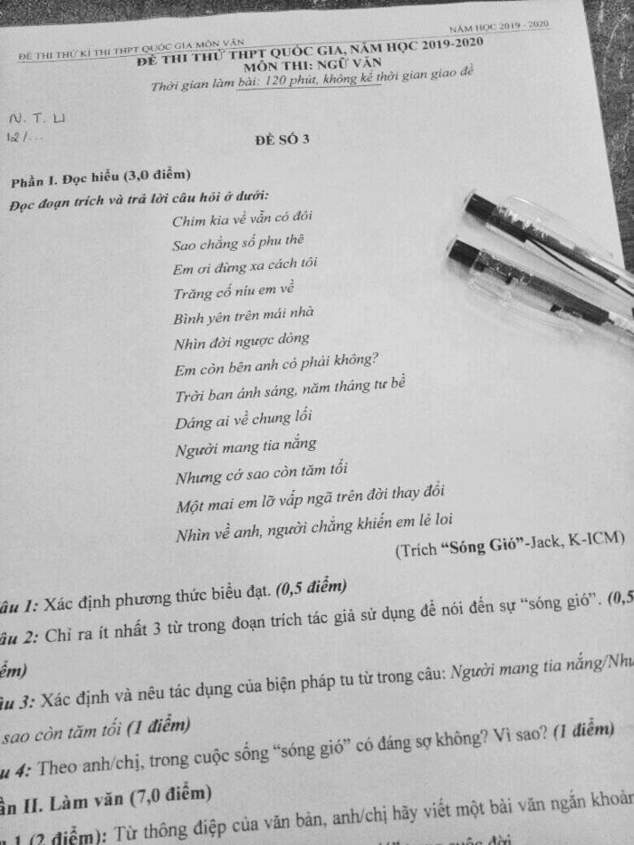 Mới đây, mạng xã hội lan truyền bức ảnh được cho là đề thi thử THPT Quốc gia năm 2019 -2020, môn Ngữ Văn. Trong đó, ở đề số 3 xuất hiện một đoạn lời trong bài hát Sóng gió của Jack & K-ICM cùng 4 câu hỏi đi kèm yêu cầu xác định phương thức biểu đạt của đoạn lời trên, biện pháp tu từ được sử dụng, chỉ ra 3 từ tác giả sử dụng để nói đến sự “sóng gió”,…