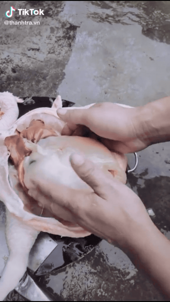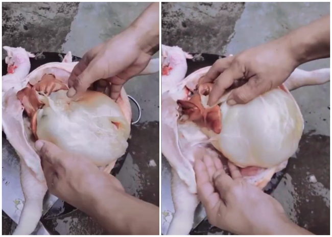 Đoạn clip ngắn quay cảnh bên trong bụng chú gà đã được vặt sạch lông đang là tâm điểm bàn tán xôn xao trên mạng xã hội TikTok, bởi cục gì đó tròn tròn hiện ra nhìn rất giống cục mỡ khổng lồ. Có thể thấy rõ miếng mỡ ấy núng na núng nính khi đụng tay vào, chiếm diện tích hết 2/3 nội tạng chú gà, màu vàng óng khá đẹp.