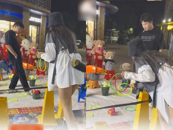 Ông chủ đứng 1 bên quan sát cũng sốt ruột đến mức phải chạy ra giảm độ khó của game giúp cô. Lần đầu tiên anh ta đẩy con gấu bông lại gần hơn nhưng cô vẫn ném trượt. Sau đó anh ta bỏ luôn con gấu ra khỏi xô cho cô dễ ném nhưng kết quả vẫn thế. Cuối cùng anh ta còn cởi dây chắn ra dí cô gái lại sát sàn sạt, thiếu điều cầm vòng ném hộ luôn thì cô mới ném trúng được.