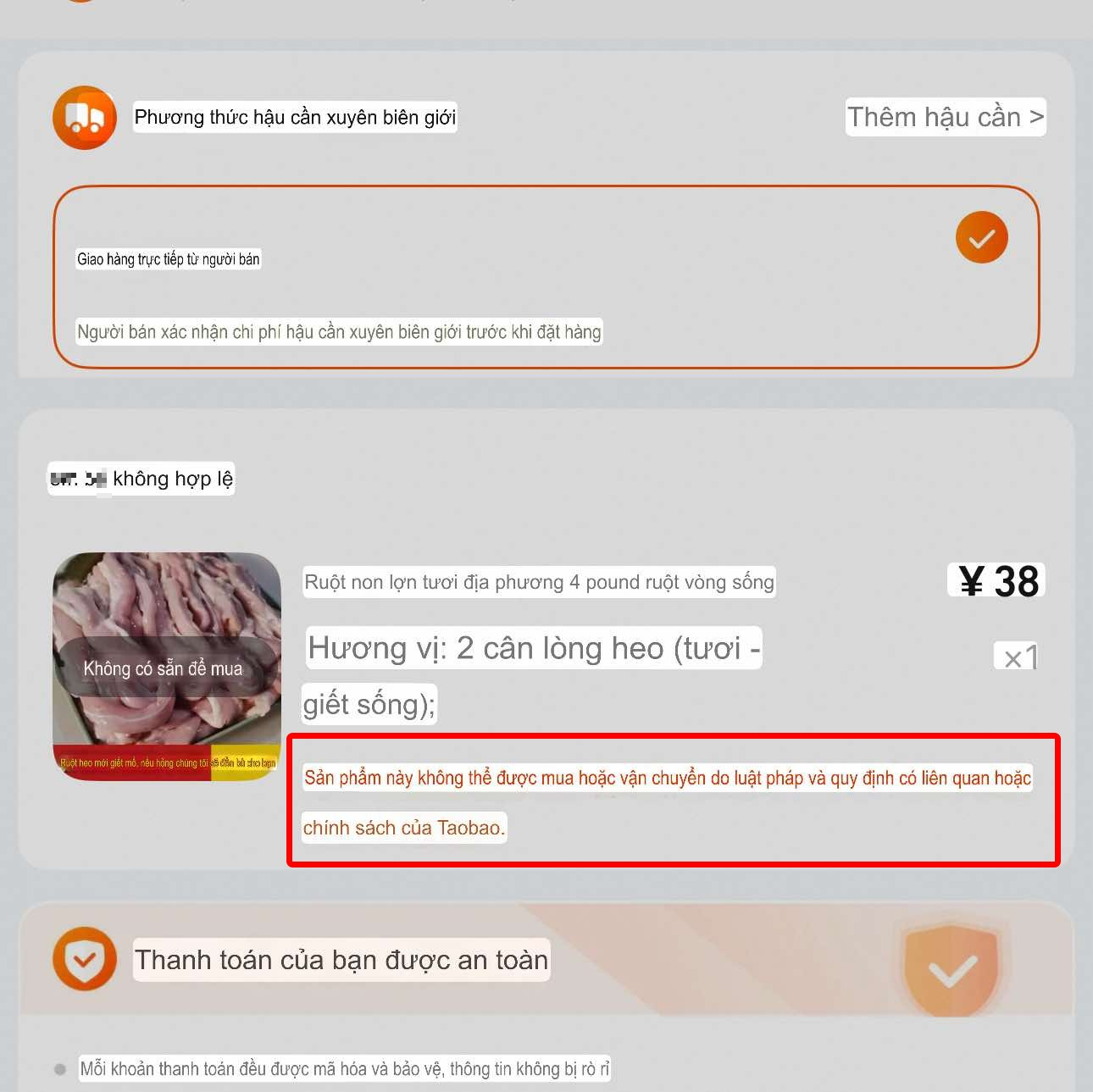 Tuy nhiên, khi chúng tôi tiến hành xác thực thì bức ảnh đang lan truyền thực chất được lấy từ sàn thương mại điện tử của Trung Quốc. Trong đó chỉ rõ đây là loại lòng non thông thường, không phải lòng se điếu. Ngoài ra, khi thực hiện thao tác thanh toán thì nhận được thông báo "không thể mua hoặc vận chuyển do luật pháp và quy định có liên quan...". Do đó, việc lan truyền bức ảnh lòng heo trên sản thương mại điện tử Trung Quốc rồi khẳng định lòng se điếu ở Việt Nam nhập từ Tmall Trung Quốc là thiếu căn cứ!