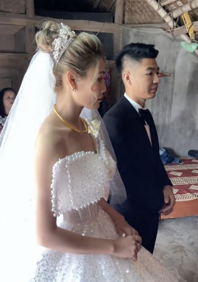 Theo những hình ảnh được chia sẻ trong đoạn clip, cô dâu - chú rể đang làm lễ cúng gia tiên trong một ngôi nhà tranh vách đất khá cũ. Ngôi nhà cổ được bài trí khá đơn giản, chỉ có chiếc giường, phía sảnh chính là bàn thờ tổ tiên, phía ngoài sân có bộ bàn ghế gỗ. Phần trát tường trong nhà đều đã bị bong tróc, xuống cấp.