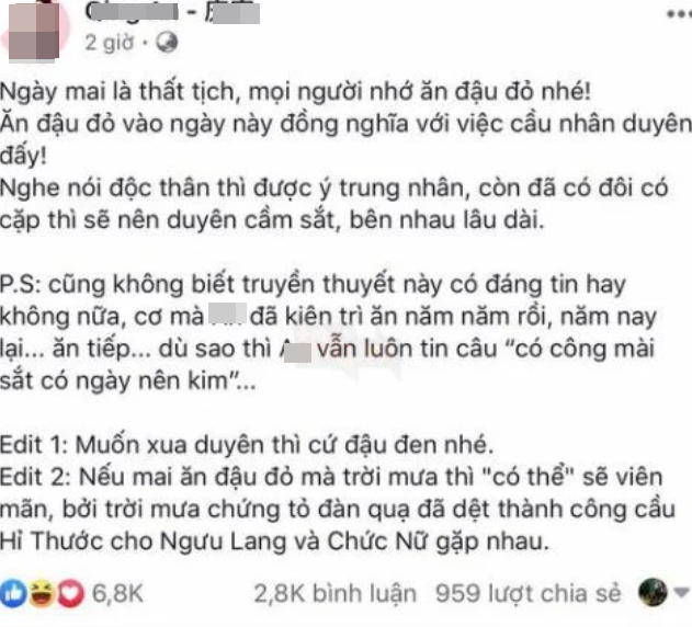 Được biết, cách đây khoảng 2 năm, trào lưu ăn chè đậu đỏ giúp thoái ế này gây bùng nổ khắp Châu Á nhờ bài đăng của một “hot face” có tên là Q.A. Cụ thể, trong bài đăng của mình, Q. A kêu gọi bạn bè ăn chè đậu đỏ ngày Thất Tịch để cầu tình duyên. Ngay sau đó, câu chuyện về việc ăn đậu đỏ ngày Thất Tịch nhanh chóng được lan truyền và được "thêm mắm dặm muối", vô tình khiến nhiều người bỏ qua truyền thống cốt lõi của ngày lễ này.