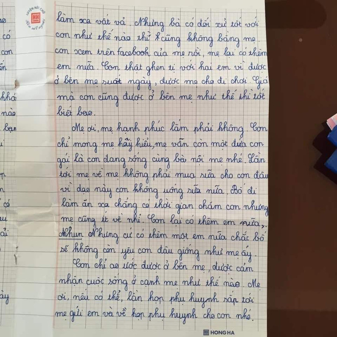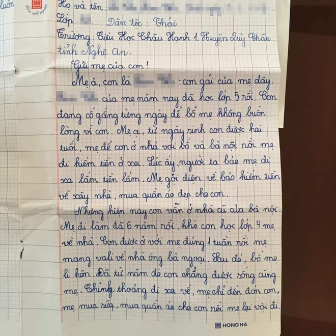 Hai ngày vừa qua, mạng xã hội nghẹn ngào, thương cảm trước nội dung bức thư của em L.T.K.C. , học sinh lớp 5 ở huyện Quỳ Châu, tỉnh Nghệ An gửi mẹ của mình. Trong lá thư, K.C rất buồn vì bố mẹ ly hôn, mẹ đi bước nữa, còn bố làm ăn xa nhà. Bản thân K.C phải sống cùng bà nội và lúc nào cũng mong ngóng mẹ đến thăm.