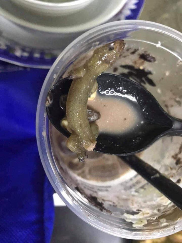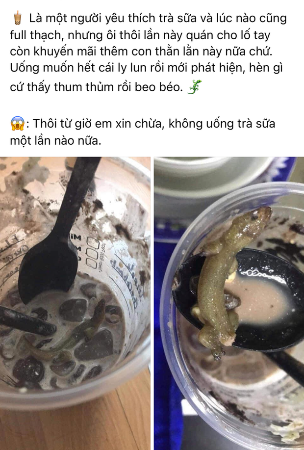 Theo đó, vì quá yêu thích các món topping trong trà sữa nên lần nào đi uống cô nàng này cũng gọi quá tay. Tuy nhiên, sự cố xảy ra khi uống gần hết thì cô mới phát hiện ra có thằn lằn "nguyên con" ở gần cuối ly trà sữa. Theo lời kể, ly trà sữa này có vị "thum thủm beo béo".
