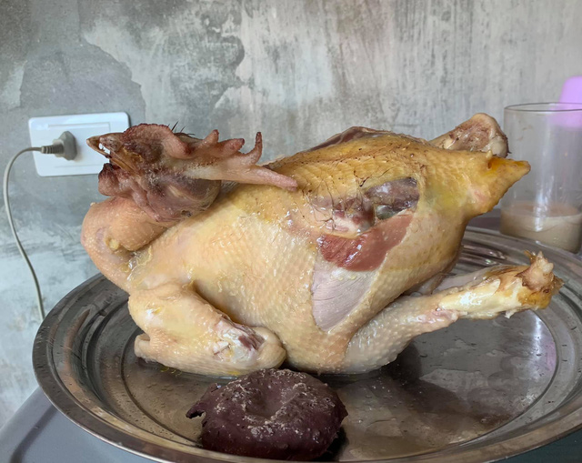 "Hai con là 1 nhưng có sự lươn lẹo đôi chút và có thể thói quen sống ảo nên con thứ 2 em chụp app, cái cổ mọi người thắc mắc sao nó khác. Thì là bởi vì luộc mềm quá cổ không đứng được, em phải lấy tăm ghim thẳng cổ lên ạ", chị Linh giải thích khi nhiều người thắc mắc hai con gà có vẻ khác nhau.