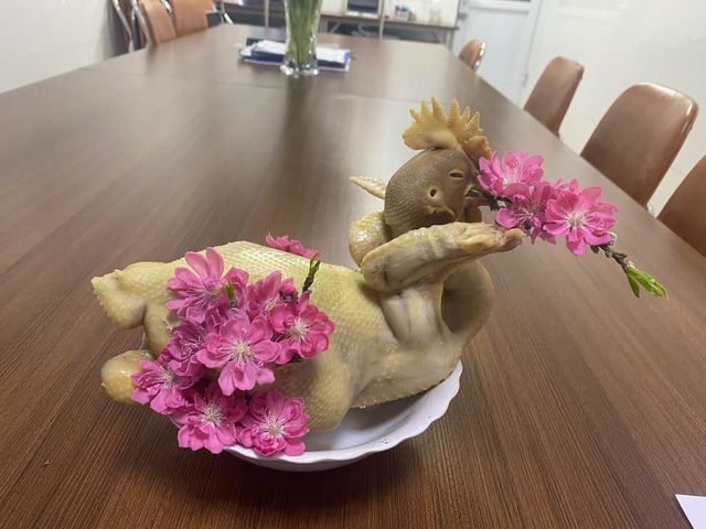 "Cây đào nhà em vẫn ổn các bác ơi, nở bung luôn ạ , đúng là rút kinh nghiệm sâu sắc cho lần sau, cả năm luộc gà không sượt da gà con nào cả ai ngờ cuối năm muốn thể hiện tý mà", chị Linh chia sẻ sau khi dùng hoa đào để trang trí cho gà.
