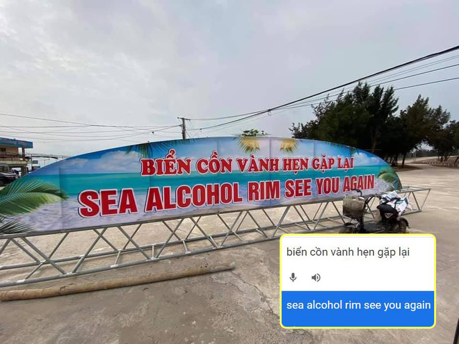 Theo đó, chẳng rõ chuẩn bị nội dung thế nào mà một tấm biển nổi bật với dòng chữ cả tiếng Việt lẫn tiếng Anh: "Biển Cồn Vành hẹn gặp lại - Sea Alcohol rim see you again".
