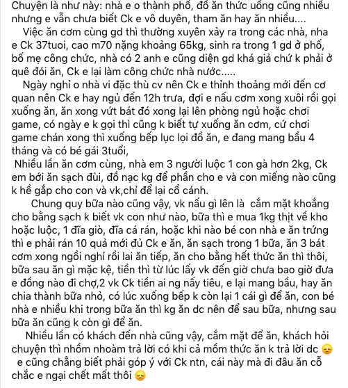 Mặc dù biết câu chuyện "không mấy hay ho", nhưng có lẽ cùng cực lắm người vợ ấy mới phải lên mạng xã hội để tâm sự. Ngay sau khi đăng tải, câu chuyện này đã thu hút rất nhiều sự chú ý của cánh chị em. Ai nấy đều ngạc nhiên xen lẫn hiếu kì và đặt ra câu hỏi "tại sao lại có 1 ông chồng vô tâm và ham ăn đến thế?":