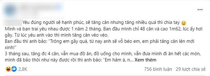 "Yêu đúng người sẽ hạnh phúc, sẽ tăng cân nhưng tăng nhiều quá thì chia tay. Mình và bạn trai yêu nhau được 1 năm 2 tháng. Ban đầu mình chỉ 48 cân và cao 1m62, lúc ấy hơi gầy. Từ lúc yêu anh vào thì mình tăng cân vèo vèo.