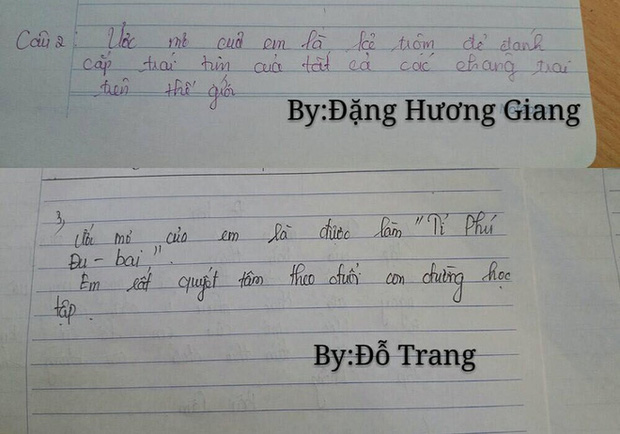 Gần đây, một loạt bài kiểm tra Văn hài hước kể về ước mơ cũng trở nên viral. Khi được yêu cầu viết về ước mơ trong tương lai, thay vì viết nghiêm túc rằng muốn trở thành bác sĩ, công an, cô giáo... nhiều người lại cho ra đời những ước mơ hài hước vô cùng!