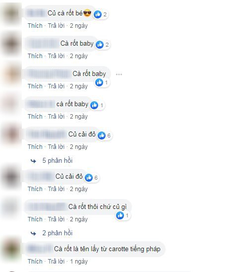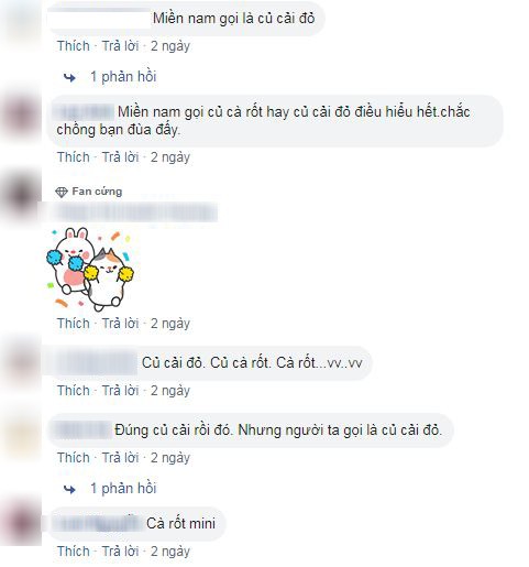 Bực mình quá các mẹ ạ, đang đi ăn tối ngon lành lại hóa ra cãi nhau chỉ vì cái củ này. Chồng em thắc mắc không biết các bạn miền Nam gọi củ này với tên gọi là gì? Em thì bảo gọi là cà rốt chứ gọi gì. Dù to hay nhỏ nó vẫn là cà rốt thôi. Nhưng lão nhất quyết KHÔNG. Chắc chắn không phải gọi bằng cà rốt, ơ hay, không gọi cà rốt thì gọi là củ cải à? Các bạn ở miền nam giải đáp giúp em với?".