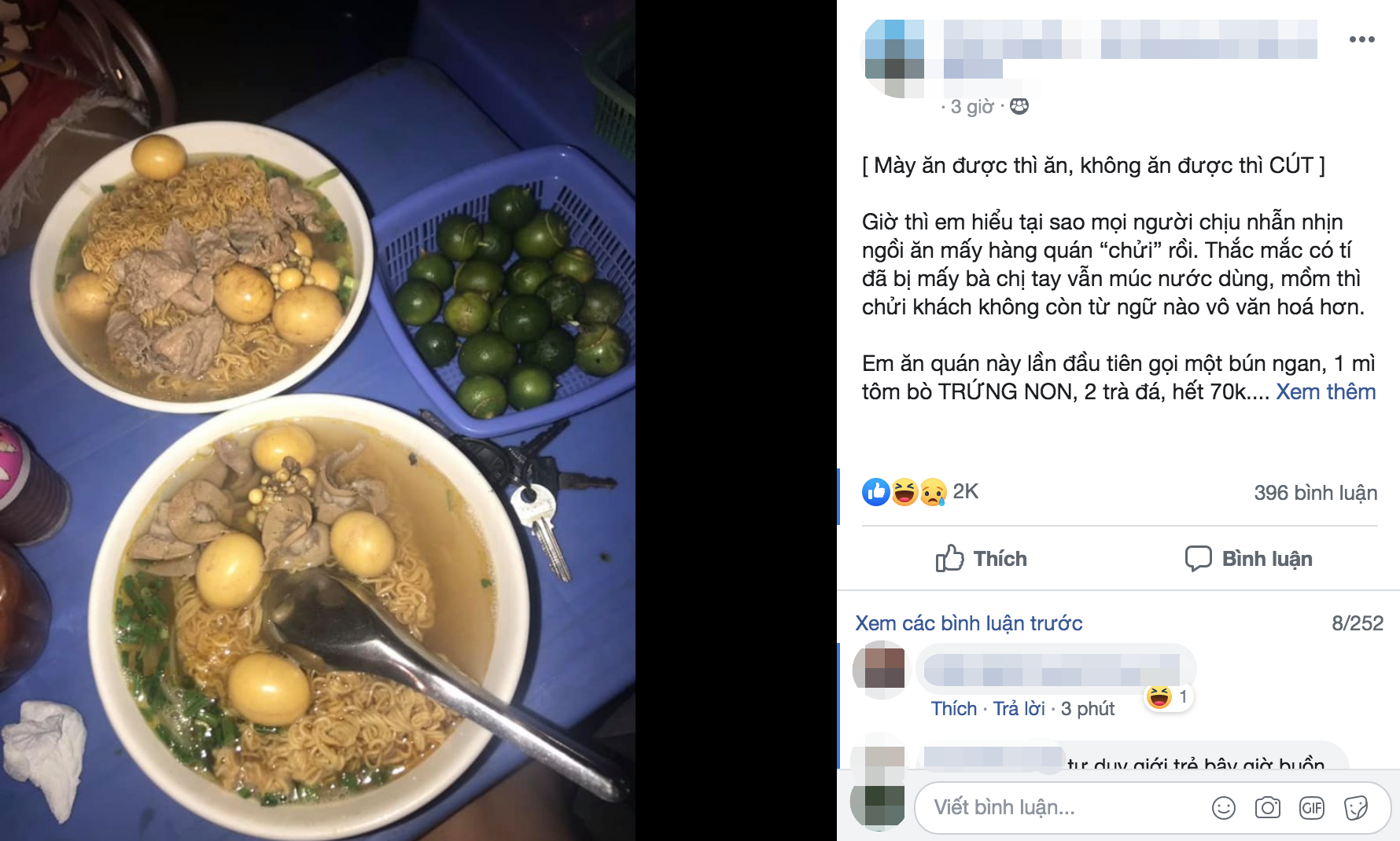 Thế nhưng nếu như số tiền bỏ ra không tương xứng với dịch vụ thì lại là một chuyện hoàn toàn khác. Mới đây, một tài khoản Facebook có tên T.H đã đăng đàn chia sẻ về trải nghiệm đi ăn đêm và gặp quán mì "chửi" khiến dân mạng quan tâm.