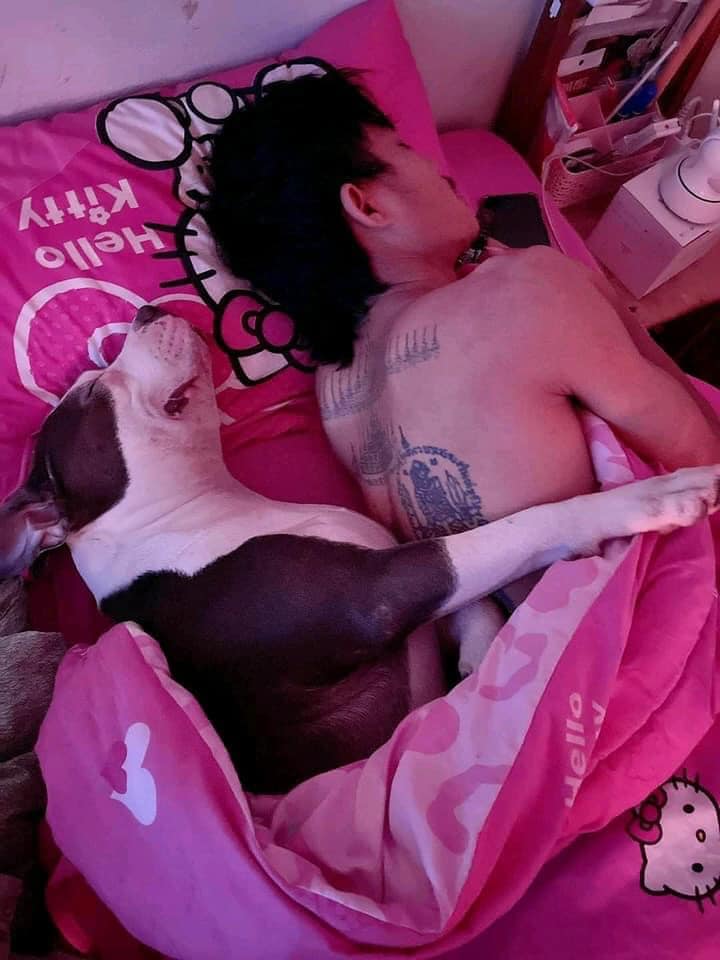 Nhìn dáng nằm bá đạo của "trà xanh" này mới thực buồn cười. Lúc thì nó đưa chi trước ôm ấp chồng chị T. Lúc sau lại nằm ngửa tơ hơ ngủ say như chết không hề biết đang bị chị chủ bắt gặp cảnh này.