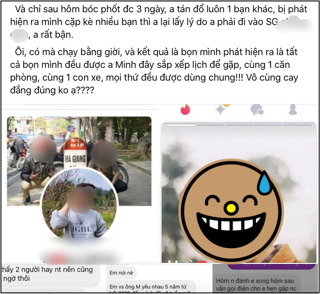 Và chỉ sau hôm bóc phốt được 3 ngày, anh tán đổ luôn 1 bạn khác. Bị phát hiện ra mình cặp kè nhiều bạn thì anh lại lấy lý do phải vào Sài Gòn công tác, bận lắm.