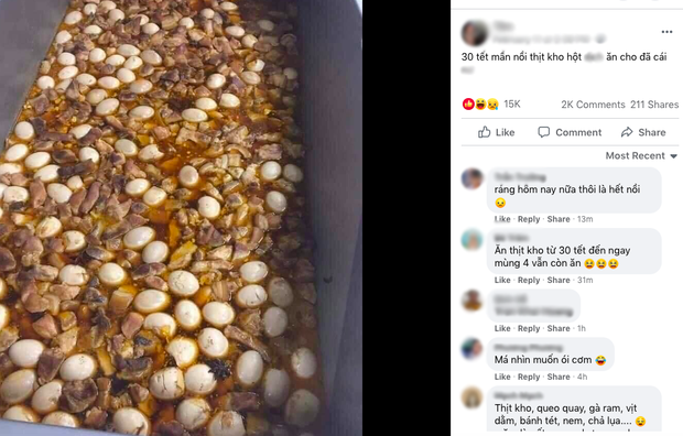 Đơn cử như khay thịt kho khổng lồ đang viral trên MXH gần đây. Một thanh niên chia sẻ nồi thịt kho này được làm từ 30 Tết để ăn cho đã, nhưng dân mạng lại nghĩ khác: