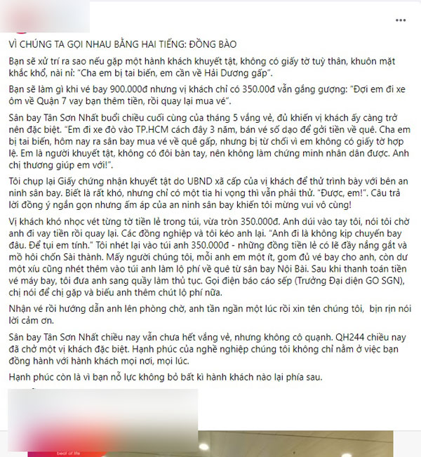 Vị khách khó nhọc vét từng tờ tiền lẻ trong túi, vừa tròn 350.000đ. Anh dúi vào tay tôi, nói tôi chờ anh đi vay tiền rồi quay lại. Các đồng nghiệp và tôi kéo anh lại. “Anh đi là không kịp chuyến bay đâu. Để tụi em tính.” Tôi nhét lại vào túi anh 350.000đ - những đồng tiền lẻ có lẽ đầy nắng gắt và mồ hôi chốn Sài thành. Mấy người chúng tôi, mỗi anh em một ít, gom đủ vé bay cho anh, còn dư một xíu cũng nhét thêm vào túi anh làm lộ phí về quê từ sân bay Nội Bài. Sau khi thanh toán tiền vé máy bay, tôi đưa anh sang quầy làm thủ tục. Gọi điện báo cáo sếp (Trưởng Đại diện GO SGN), chị nói để chị gặp và biếu anh thêm chút lộ phí nữa.