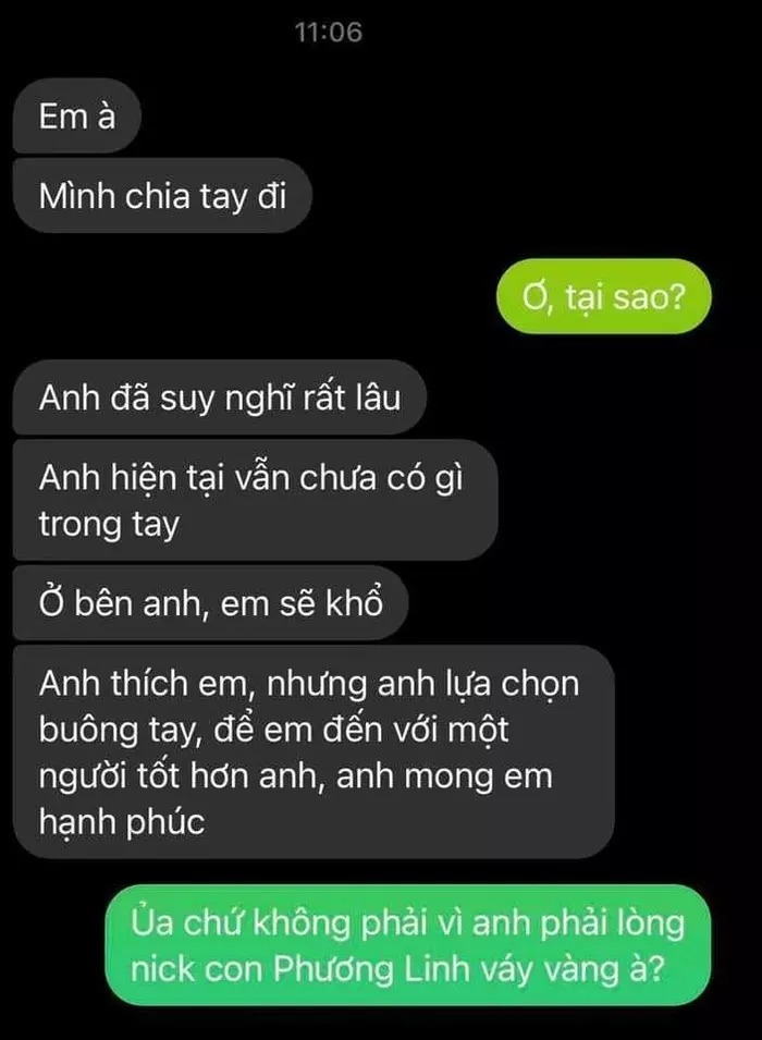 Chuyện gì đến cũng phải đến, bạn trai chủ động nhắn tin chia tay. Thế nhưng thay vì thẳng thắn, thanh niên này lại bày đặt nói giọng "văn vở" như sách mẫu. Anh ta nói rằng không muốn tiếp tục chuyện tình cảm nữa vì mình chưa có gì trong tay, chưa thể lo cho cô gái cũng như cuộc hôn nhân của họ sau này.