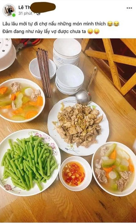 Cụ thể, thanh niên này chẳng biết có phải ế quá hóa liều hay không mà phải chạy vào một nhóm ăn uống, đăng mâm cơm nhà kèm dòng caption để thả thính: "Lâu lâu mới tự đi chợ nấu những món mình thích. Đảm đang như này lấy vợ được chưa ta".