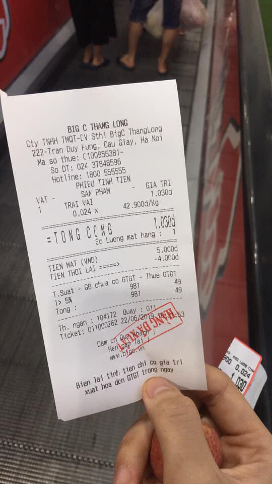 Một số người khác lại chú ý tờ hóa đơn, dù chuẩn không cần chỉnh, hoàn toàn đúng quy trình và nguyên tắc nhưng những con số "bé tẹo tèo teo" như giá gốc trái vải chỉ có 981 đồng, cộng thêm 49 đồng tiền thuế giá trị gia tăng 5% mới ra cái giá 1.030 đồng của quả vải khiến cho bao người lại thêm một tràng cười đau ruột.