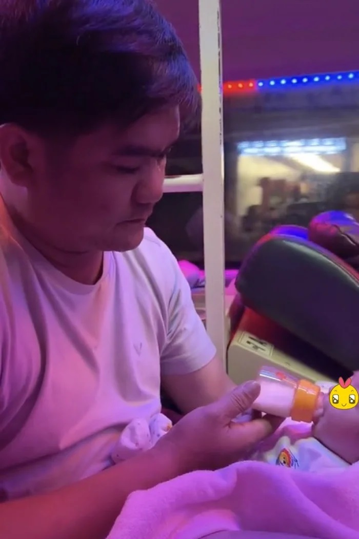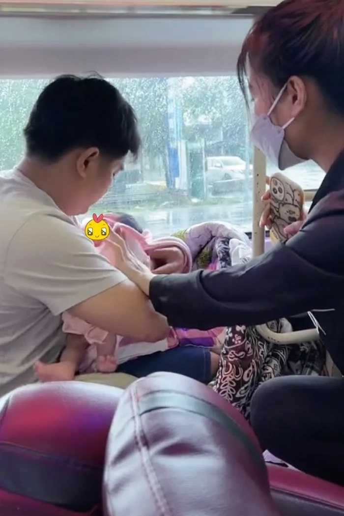 Cứ vậy suốt hành trình đứa trẻ mới vài ngày tuổi nằm trong vòng tay bố mà ngủ ngoan. Dậy lại được bố cho ăn sữa bình. Chứng kiến cảnh tượng "gà trống chăm con", nhiều hành khách trên xe xót xa thương cảm, tiến lại hỏi thăm.