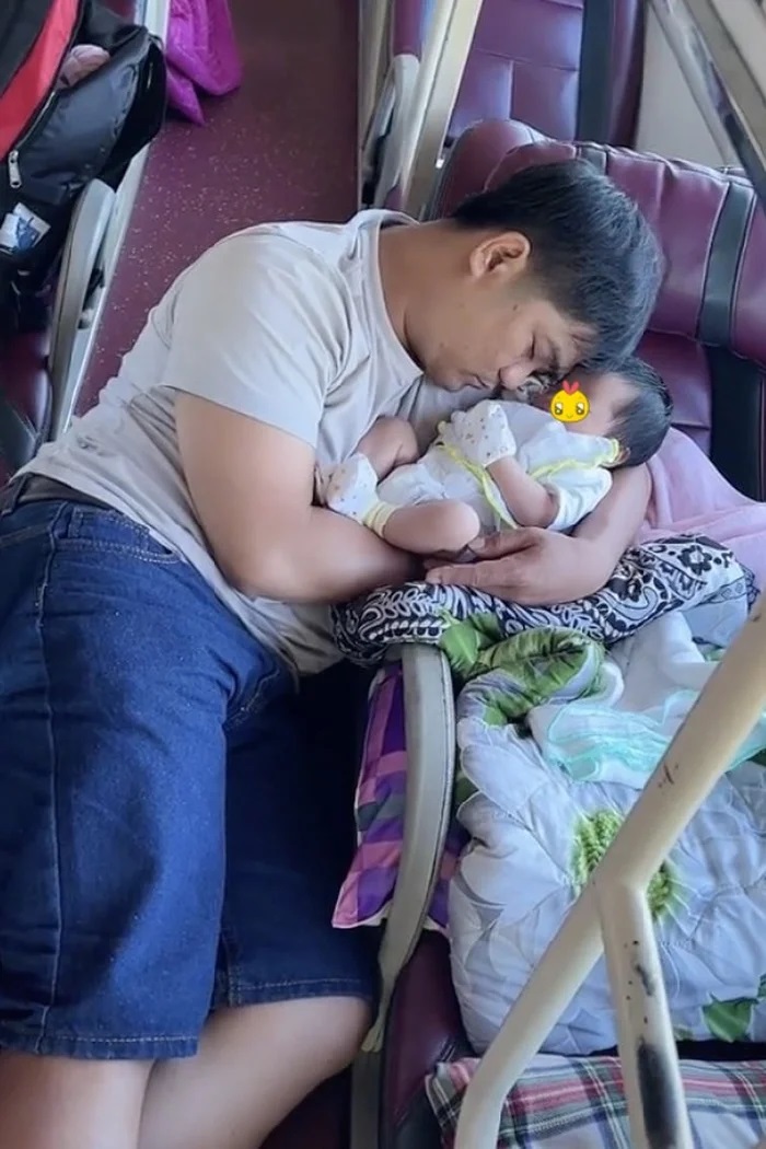 Theo đó là hình ảnh một người đàn ông nằm ngang lối đi trên xe. Bên cạnh, vòng tay anh đang bế một em bé sơ sinh ngủ say. Thỉnh thoảng chiếc xe không may đi vào đoạn gập ghềnh nên bị rung lắc, nhưng đứa trẻ nhỏ vẫn yên tâm ngủ ngon bởi có vòng tay vững chắc của bố làm điểm tựa.