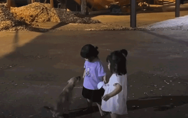 Trong clip theo dõi, có thể thấy hai bé gái khoảng 2 tuổi đang đứng trước sân nhà thì một chú chó ta màu ghi xuất hiện. Con chó hung hăng cắn vào vạt váy của bé áo trắng khiến em hoảng sợ mếu máo. Lúc này bé gái áo tím đứng cạnh thấy chuyện bất bình không thể làm ngơ, liền tung tay đánh và xua đuổi con chó để bảo vệ bạn.