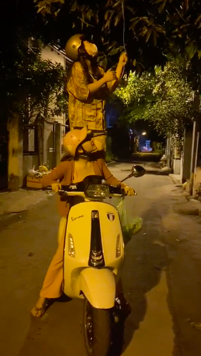 Theo đó, vì quả xoài toàn treo tít trên ngọn cây mà chiều cao lại có hạn nên 2 cô gái đã sử dụng luôn con xe máy của mình để trèo lên. Người ngồi trước giữ cho xe thăng bằng, người ngồi sau thì đứng luôn lên yên xe và hái.