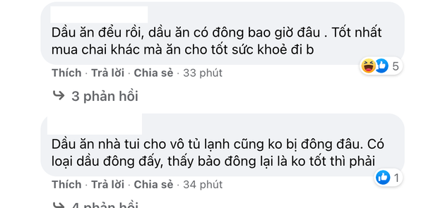 Một bức hình tưởng chừng đơn giản mà lại làm dấy lên vô số sự tranh cãi từ cư dân mạng. Một số người cho rằng vì dầu này có pha mỡ động vật nên mới đông nhanh như vậy, thậm chí còn khuyên chủ topic... vứt đi cho lẹ, ăn vào sẽ hại sức khoẻ. Thấy vậy, những netizen có kiến thức về dầu ăn đã vào cuộc "giải ngố" luôn và ngay.