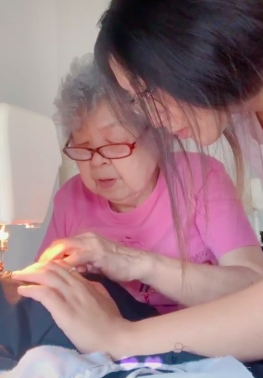 Người bà trong đoạn clip có mái tóc trắng như cước, gương mặt phúc hậu, cẩn thận kẻ, đếm, đo từng chi tiết sao cho vừa vặn nhất với số đo của cháu gái. Vì khá lớn tuổi rồi nên mắt bà không còn tinh tế để làm những việc như xâu kim, luồn chỉ nữa. Cô cháu gái sẽ là người phụ trách các chỉ số tỉ mỉ này.