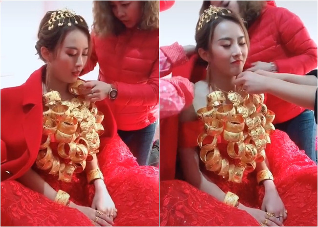 Thường thì các cặp vợ chồng trẻ chỉ đeo vài món trang sức vàng như lắc tay, nhẫn, vòng cổ để tượng trưng trong lễ cưới, nhưng đôi khi vẫn có những đám cưới "khủng" gây choáng ngợp vì cô dâu chú rể đeo vàng đỏ cả người. Một chiếc video mới được đăng tải trên mạng xã hội TikTok gần đây đã giúp cư dân mạng được "mở mang tầm mắt", ai cũng cảm thấy ghen tị hết nấc khi chứng kiến cảnh cô dâu được người thân đeo đống vòng vàng nhiều không đếm xuể, quấn quanh cổ vài vòng không hết.