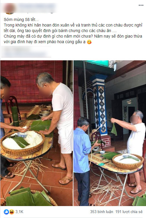 Người cháu của cụ ông này chia sẻ: "Sớm mùng 58 Tết... Trong không khí hân hoan đón xuân về và tranh thủ các con cháu được nghỉ Tết dài, ông quyết định gói bánh chưng cho các cháu ăn... Các bạn đã có dự định gì cho năm mới chưa? Năm nay sẽ đón giao thừa với gia đình hay đi xem pháo hoa cùng gấu đấy!".