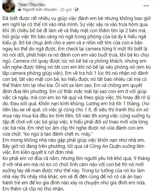 "Đã biết được rất nhiều vụ giúp việc đánh em bé nhưng không bao giờ em nghĩ lại có thể rơi vào nhà mình. Sự việc xảy ra vào trưa hôm qua.