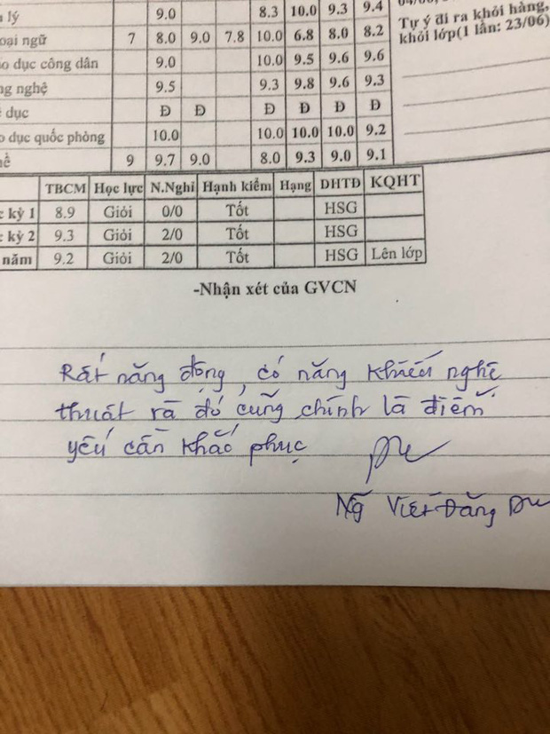 Được biết, năm học vừa qua, tập thể lớp của thầy đạt 100% học sinh giỏi. Ai cũng đều thực sự nỗ lực để có kết quả như trên, tuy nhiên với những học sinh có cá tính hay hoàn cảnh đặc biệt, thầy luôn ghi nhớ suốt năm và để lại lời nhắn đặc biệt thay những lời phê thông thường trong phần phiếu điểm. Chẳng hạn như về một nam sinh hiếu động nhưng thường bỏ qua các quy tắc, thầy cũng dành lời khuyên nhẹ nhàng nhưng đủ thấm để cậu học trò của mình nhận ra những mặt chưa tốt của tính cách.