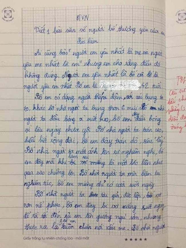 Mới đây, cộng đồng mạng lại được phen cười bục ruột với một bài văn tả bố của học sinh tiểu học. Được biết đây là bài văn của một em học sinh ở Nghệ An. Dựa trên những quan sát thực tế hàng ngày, cô nhóc đã liệt kê hết những điểm xấu của bố, từ chuyện tóc bết dính lâu ngày không gội, trán dô, mắt láo liên đến chuyên nói xấu mẹ