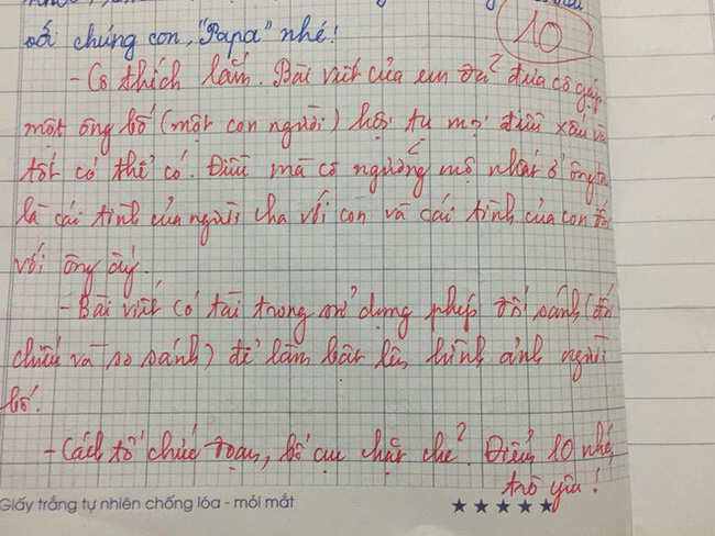 Chính điều này đã khiến giáo viên vô cùng ấn tượng và quyết chấm điểm 10, cùng dòng nhận xét: "Cô thích lắm. Bài viết của em đã đưa cô gặp một ông bố (một con người) hội tụ mọi điều tốt và xấu có thể có. Điều mà cô ngưỡng mộ nhất ở ông ta là cái tình của người cha đối với con và cái tình của con đối với ông ấy".