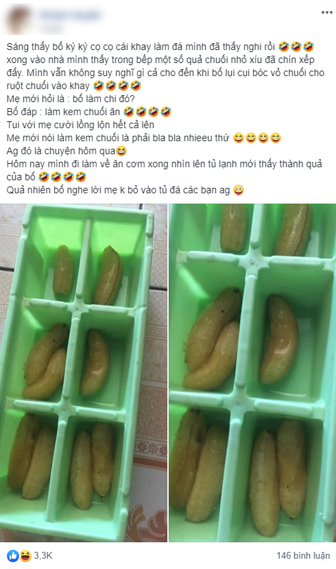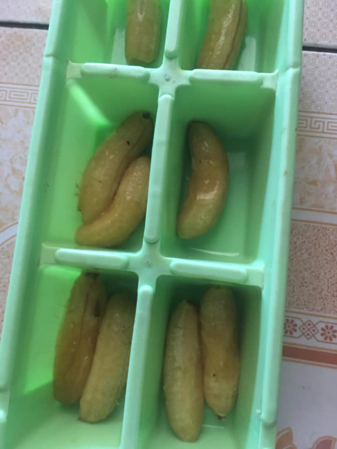 Cô gái chia sẻ: "Sáng thấy bố kỳ kỳ cọ cọ cái khay làm đá mình đã thấy nghi rồi. Xong vào nhà mình thấy trong bếp một số quả chuối nhỏ xíu đã chín xếp đấy. Mình vẫn không suy nghĩ gì cả cho đến khi bố lụi cụi bóc vỏ chuối cho ruột chuối vào khay.