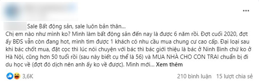 Chị em nào như mình không? Mình làm bất động sản đến nay là được 6 năm rồi. Đợt cuối 2020, đợt ấy bất động sản vẫn còn đang hot, mình tìm được 1 khách có nhu cầu mua chung cư cao cấp. Đại loại sau khi bác chốt mua, đặt cọc thì lúc nói chuyện với bác thì bác giới thiệu là bác ở... chứ không ở Hà Nội, cũng hơn 50 tuổi rồi (sau này biết cụ thể là 56) và mua nhà cho con trai chuẩn bị đi du học về (đợt đó dịch nên anh ấy không về được). Mình mới trêu là:
