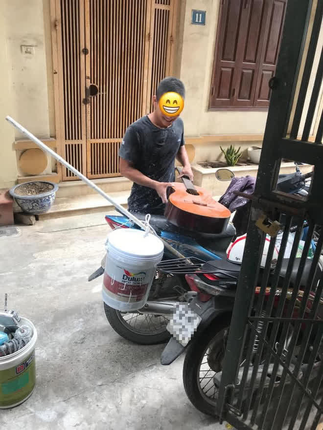 Kèm với câu chuyện chính là hình ảnh anh thợ cặm cụi sơn lại tường để "đổi" lấy cây đàn guitar cũ. Hình ảnh anh cười hớn hở cầm cây đàn rồi cột gọn gàng sau xe máy để đèo về thật sự quá đáng yêu.