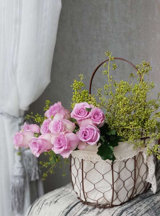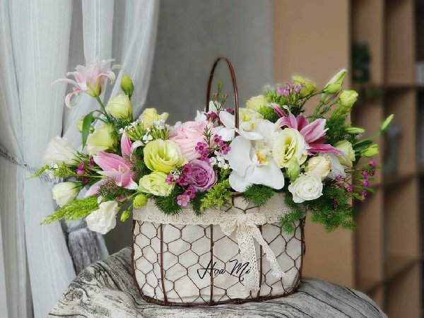 Giỏ hoa được cắm theo phong cách châu Âu đẹp ngây ngất.