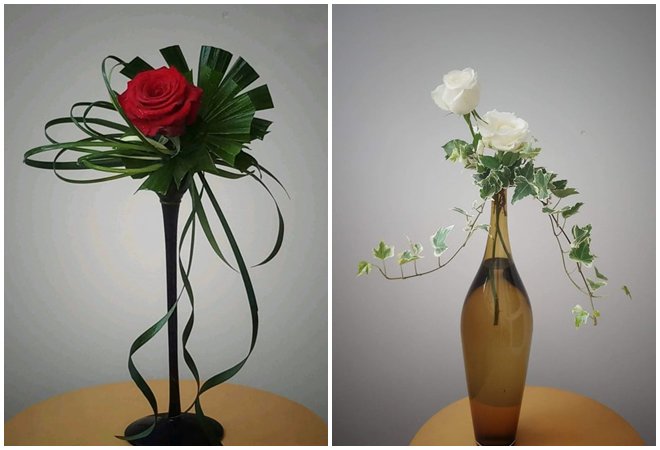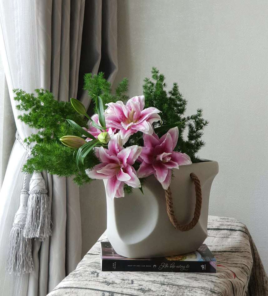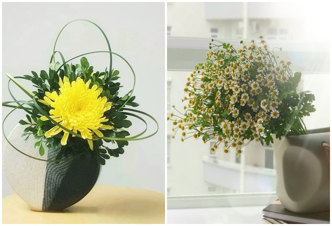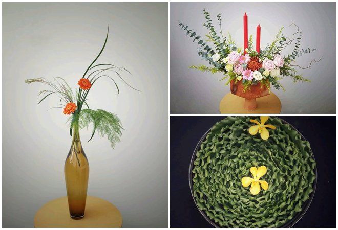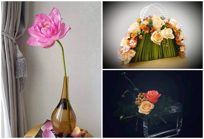 Hoa còn dư mình cắm các bình hoa theo phong cách free style của Ikebena nên mình cũng có bộ sưu tập vừa bình Ikebena, vừa bình hoa thả lọ, giỏ hộp hoa các loại số lượng không dám đếm, chắc gần 100 rồi”, chị Thủy tư vấn.