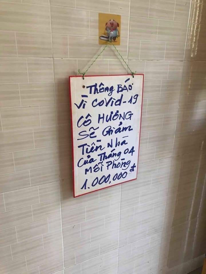 Đính kèm với chia sẻ là hình ảnh cô chủ nhà ngại ngùng khi bị chụp ảnh cùng với thông báo: "Vì Covid-19, cô Hương sẽ giảm tiền nhà của tháng 4 mỗi phòng 1 triệu đồng".