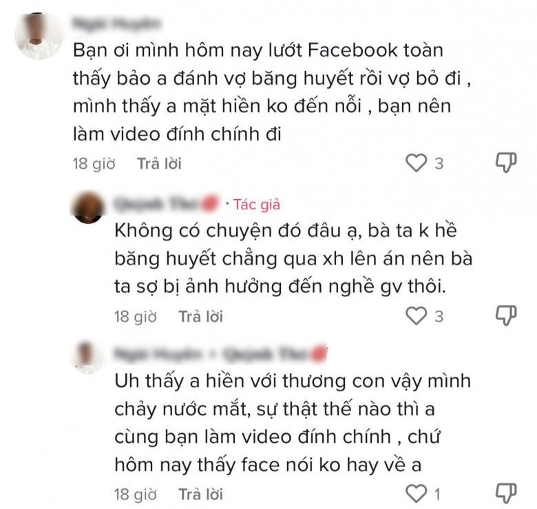 Trước câu hỏi liên quan đến những thông tin về việc bạo hành vợ đến mức bỏ đi, người này khẳng định không có chuyện đó xảy ra: “Không có chuyện đó đâu, chị ta không hề bị đánh băng huyết, chẳng qua xã hội lên án nên sợ bị ảnh hưởng đến nghề giáo viên thôi. Lúc cậu mình sang nhà bảo về thì cả vợ lẫn mẹ vợ đuổi, hắt hủi. Xin lại giấy chứng sinh để cho con đi máy bay nhưng không chịu đưa”.