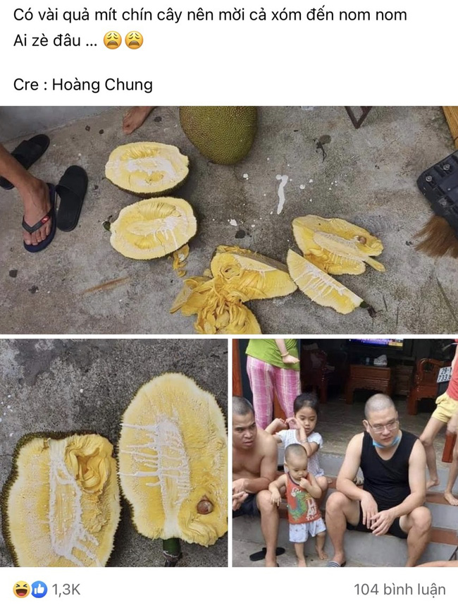 Cụ thể, một người vừa thu hoạch được vài quả mít chín cây liền mời hàng xóm sang "chung vui". Tuy nhiên, khi lần lượt bổ hai quả mít ra thì kết quả khiến người này "méo mặt". Hàng xóm trông thấy quả mít vàng ươm nhưng chỉ toàn sơ mít và vài múi thịt nên cũng chẳng ai nỡ "thưởng thức" chung nữa.