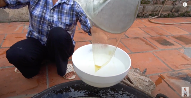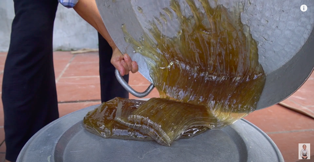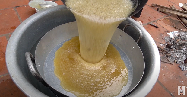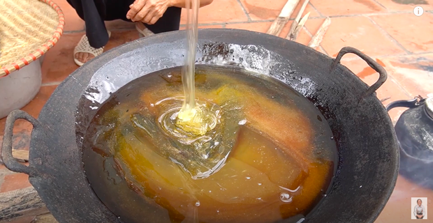 Sau khi cho một ít nước vào chảo, bà Tân tiếp tục bỏ đường và mạch nha vào rồi đảo đều tay cho đến lúc sôi. Sau đó, bà lấy thử một ít cho vào bát nước lạnh để xem kẹo có đặc lại hay chưa. Kiểm tra xong, bà Tân đổ hết hỗn hợp ra một chảo lớn khác và chờ nguội.