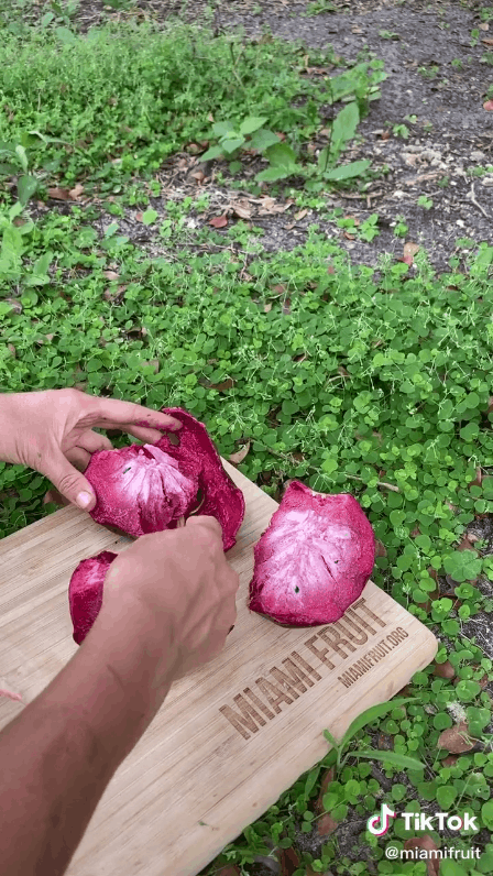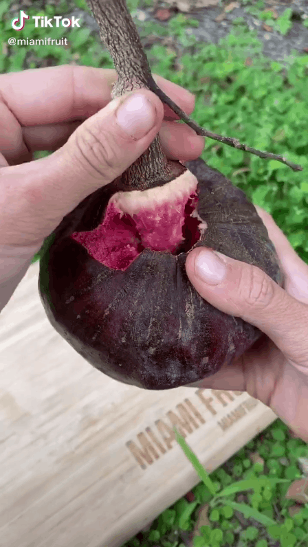 Theo đó trên phần caption, trang đăng video giới thiệu đây là một loại na, người quay cũng trực tiếp giơ những “quả na tím” lên trước ống kính, thực hiện các thao tác như bỏ cuống, bổ đôi, còn xúc một phần thịt lên cho mọi người người xem.