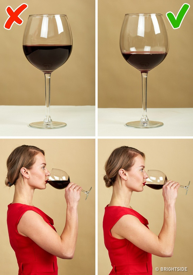 Và đặc biệt khi uống rượu vang, đừng nên rót quá nhiều. Một ly rượu quá đầy thường không đẹp về mặt thẩm mỹ, cũng như tiềm ẩn rủi ro rơi vãi, sánh vào quần áo.
