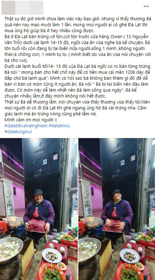 Dưới cái lạnh buổi tối của Đà Lạt, bà ngồi co ro bán từng trứng. Bà nói: "Mong bán cho hết chỗ này để có tiền mua cái mền 120k dày để đắp chứ bà lạnh quá". Mình có hỏi sao bà không bán thêm gì đó để dễ bán vì bán có món cũng ít người ăn, bà nói: "Bà bị tai biến nên đâu làm được. Có món này dễ làm nhất nên bà làm sống qua ngày". Bà kể chuyện nhiều lắm, ở đây mình không nói hết được.