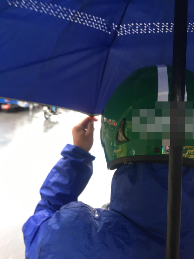 Khi mình ra đường thì không còn mưa nữa. Book 1 chiếc xe ôm, anh ấy chỉ có mỗi bộ quần áo mưa liền quần cho ảnh thôi.