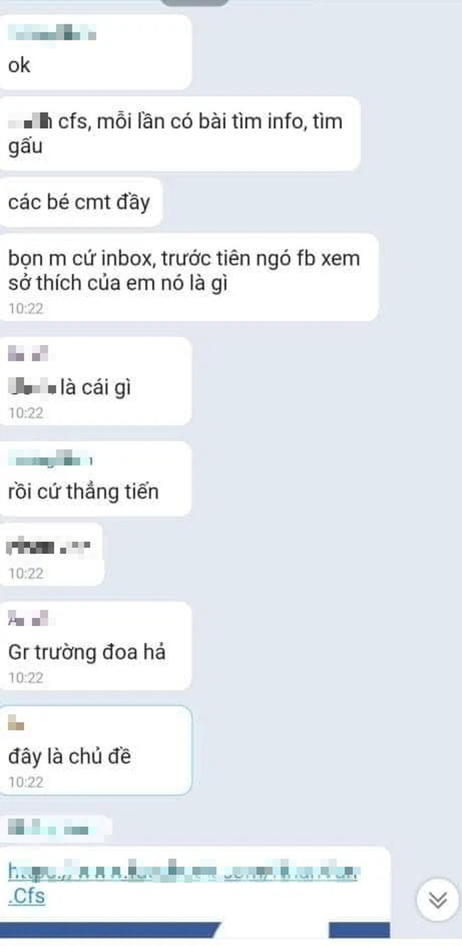 H.N: "Vô mấy kí túc xá khu A, khu B hay confesstion... Mỗi lần có bài tìm infor, tìm gấu các bé comment đầy. Bọn mày cứ inbox, trước tiên ngó xem sở thích của em nó là gì rồi cứ thẳng tiến".