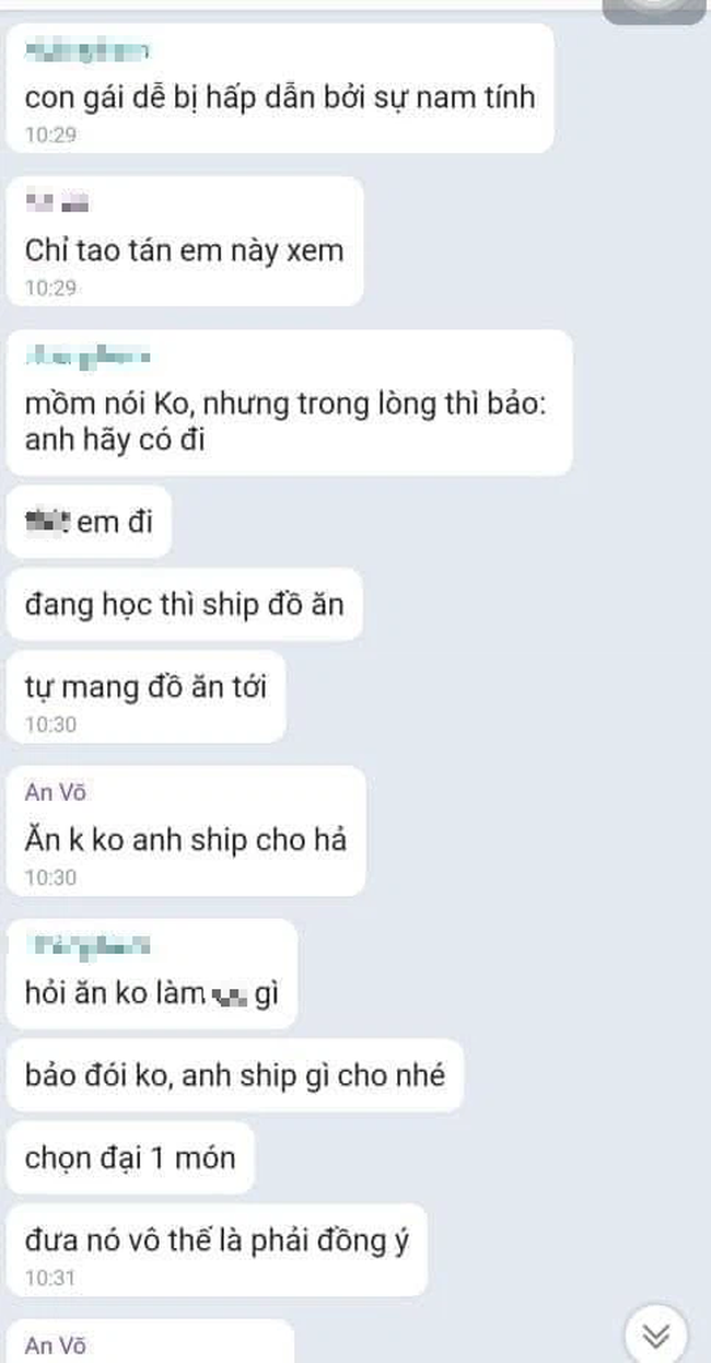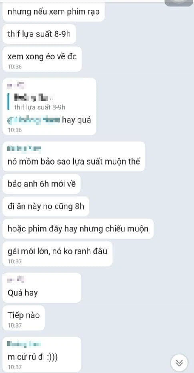 15/09/2021 17:37Tiếp tục lộ đoạn chat các quý anh chăn rau chia sẻ nhiều chiêu dụ gái kinh hãi, 'hành sự' luôn ở rạp chiếu phim: 'Đưa nó vào thế phải đồng ý'